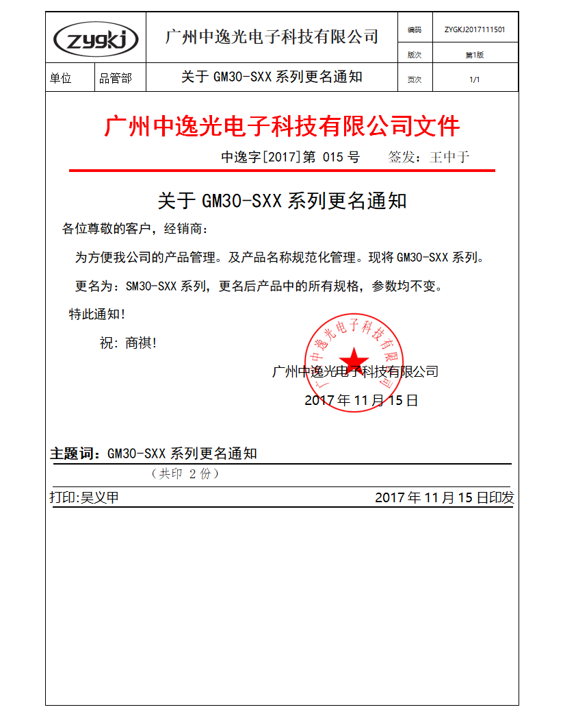 關于産品外(wài)殼變更和(hé)GM30産品名稱變更事(shì)宜通®÷÷(tōng)知(zhī)