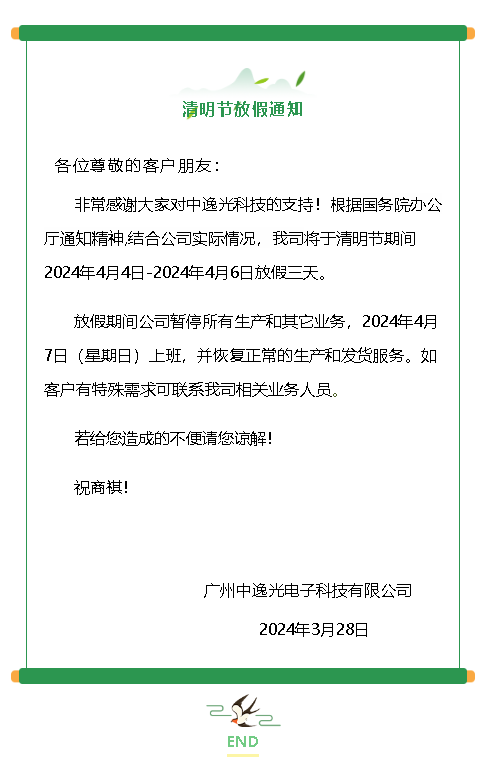 中逸光(guāng)科(kē)技(jì)2024年(n→§&ián)清明(míng)節放(fàng)假通(tōng)知(zhī)