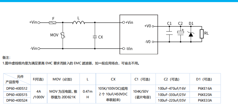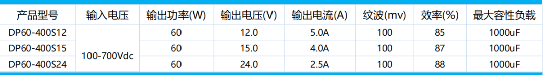 DP60-400SXX系列産品是(shì) 100-700VDC 超高(gāo)電(diàn)∏<壓輸入高(gāo)效率高(gāo)可(kě)靠性的(de) DC-DC 開(kāi)關穩壓電( γdiàn)源模塊,可(kě)廣泛應用(yòng)于光(guāng)伏發電(diàn)和(hé)≈β★高(gāo)壓變頻(pín)等場(chǎng)合,為(wèi)負載設備提供穩定的(de)工βσ'♣(gōng)作(zuò)電(diàn)壓,且其自(zì)帶的(de)多(duō)重保護功能≠¥•(néng)可(kě)提升模塊電(diàn)源工(gōng)作(zuò)異常情況下(xià)電(d★♥λiàn)源及其負載的(de)安全性能(né§'≠÷ng)。該系列産品應用(yòng)在電(π ¥™diàn)磁兼容比較惡劣的(de)環境下(xià)時σ€®(shí)必須參考推薦電(diàn)路(l•δΩù)。